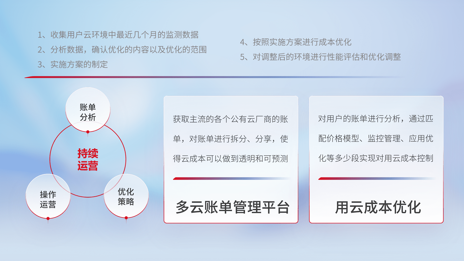 通过多云纳管,,,,以统一的资源数据模型把客户的云资源进行抽象和封装,,,进而实现对多云资源的统一操作,,,保障云资源管理的可靠性、、稳定性与可用性。。。。量身定制化运维内容,,,配置、、、、开发运维、、、、补丁管理、、备份、、、、监控、、认证和访问管理、、、审计和日常巡检等,,,,保障在用云过程中的可靠度,,,,稳定度以及高可用率。。
