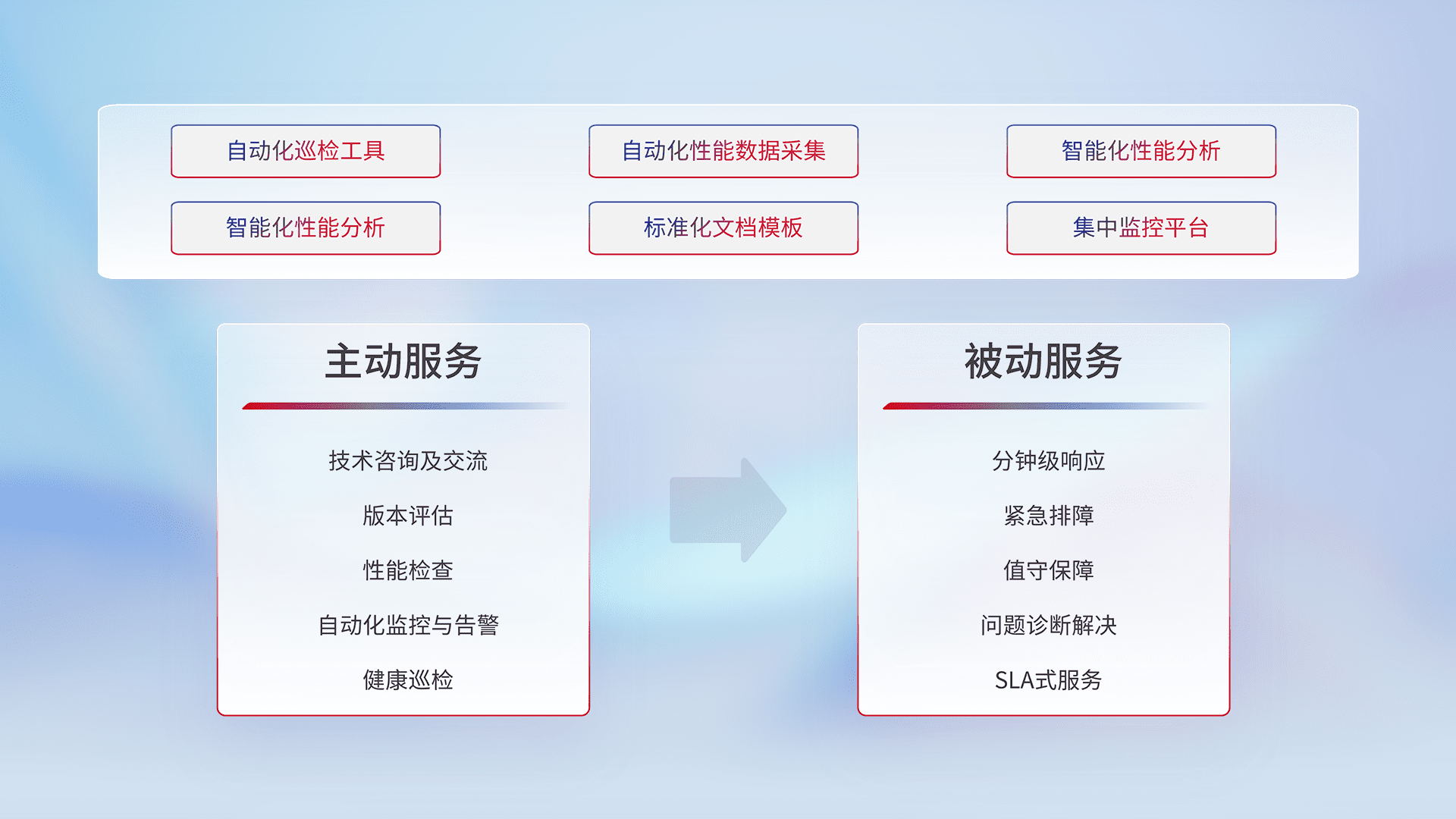 智能化工具和标准化文档,,,保障服务质量,,提供主动服务(包含技术咨询、、、、版本评估、、、性能检查、、自动化监控与告警、、健康巡检)和被动服务包含(分钟级响应、、、、紧急排障、、、、值守保障、、、、问题诊断解决、、、、SLA服务)。。。。